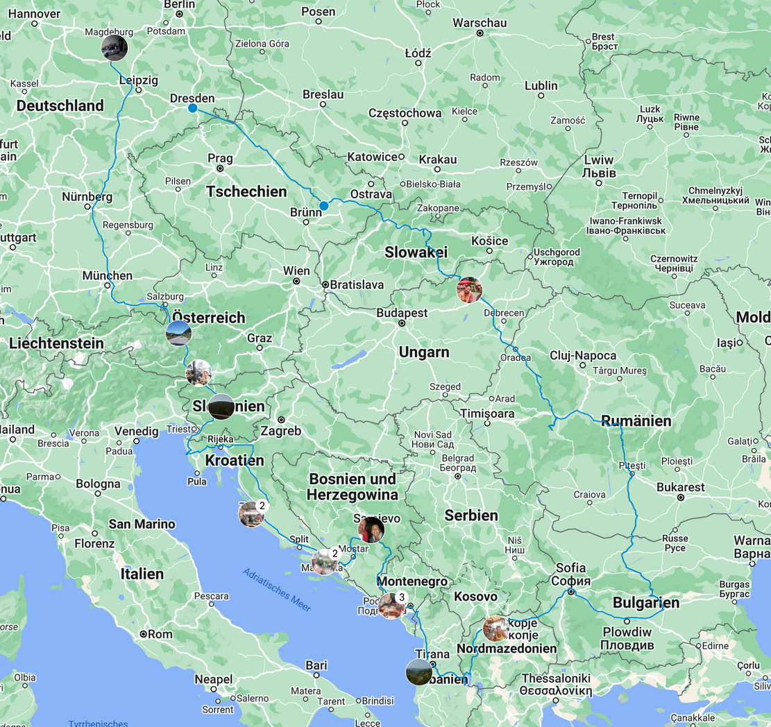 Start war am 22. August in Dresden. Dann geht es in 13 Tagen für etwa 4.000 km durch diese Stationen: