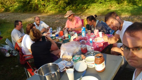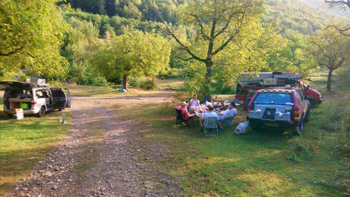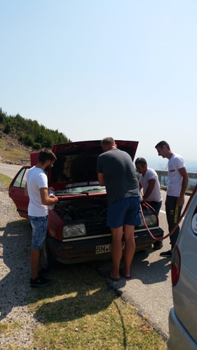 Ganz oben auf dem Berg stand eine albanische Familie, deren Auto überhitzt war. Da Thomas heute morgen unsere Outdoordusche aufgefüllt hatte, konnten wir mit Schlauch und Wasser aus den Rohren helfen. Die albanische Familie staunte nicht schlecht, was die Deutschen da so mit sich schleppen ...