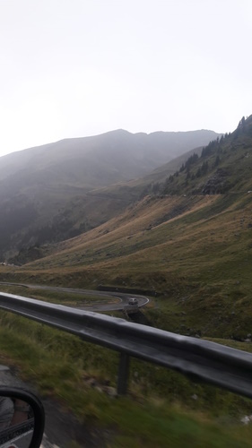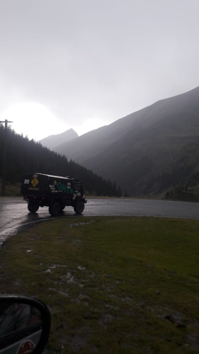 Einfahrt in die transsilvanischen Alpen bei Regen! Angeblich erwartet uns eine der spektakulärsten Straßen der Welt ... wir sind gespannt! Die Außentemperatur ist in kürzester Zeit von 34 Grad auf 19 Grad gefallen. Die Transfagarasan ist eine 117 km lange Hochgebirgsstraße, die einen Teil der transsilvanischen Alpen überquert und definitiv eines der Highlights der Tour darstellt. Mit jedem Kilometer fällt das Thermometer weiter ... wir sind bei 12 Grad!