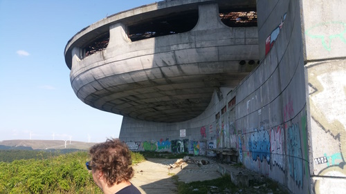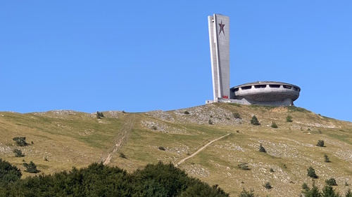 Ein kurzer Stop am Chadschi Dimitar: Das Busludscha-Denkmal ist ein Denkmal zu Ehren der sozialistischen Bewegung Bulgariens. Es befindet sich direkt auf dem Berggipfel des Chadschi Dimitar und wurde 1981 zur 1300-Jahr-Feier der bulgarischen Staatsgründung eingeweiht.